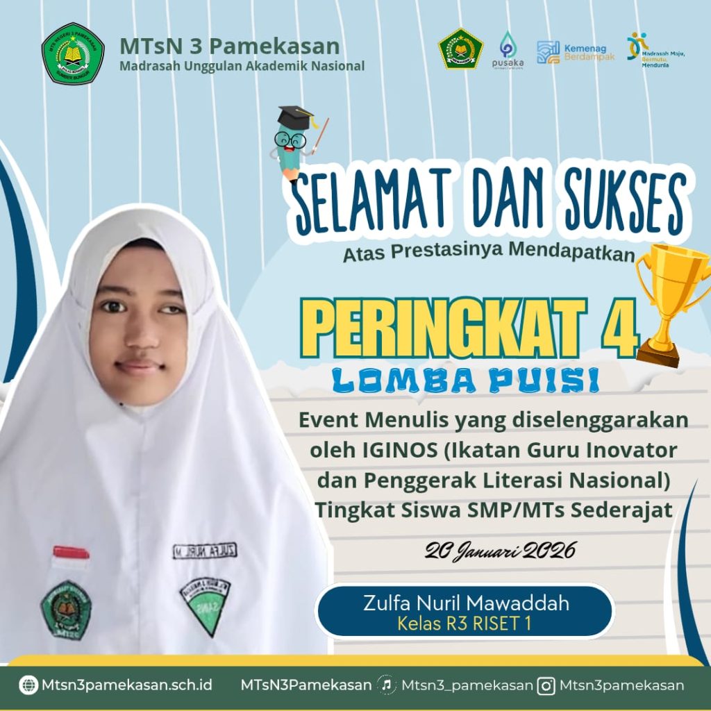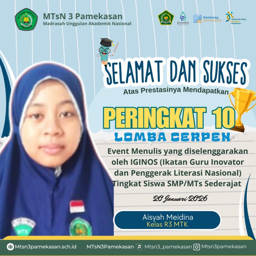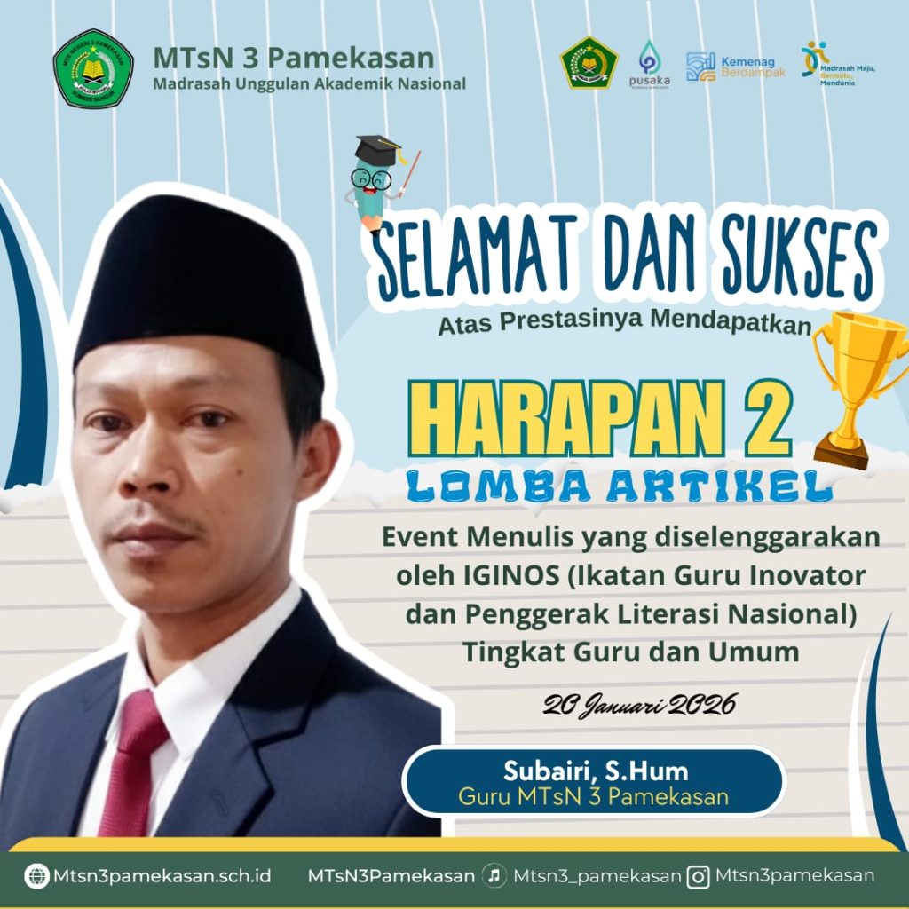 Ajang lomba IGINOS ini bukan sekadar kompetisi, melainkan sebuah gerakan literasi nasional yang mengajak seluruh insan pendidikan untuk menulis dengan hati dan mengabdi dengan ketulusan. Karya-karya yang lahir dari lomba ini menjadi saksi bahwa menulis bukan hanya aktivitas akademik, tetapi juga sarana ibadah, refleksi diri, serta bentuk pengabdian kepada bangsa dan negara. Dengan capaian prestasi yang diraih, MTsN 3 Pamekasan kembali menegaskan eksistensinya sebagai madrasah yang tidak hanya unggul dalam bidang akademik, tetapi juga aktif dalam pengembangan literasi. Semoga prestasi ini menjadi pemantik semangat bagi seluruh warga madrasah untuk terus menulis, berkarya, dan mengukir prestasi, serta menjadikan literasi sebagai napas dalam setiap langkah pendidikan.