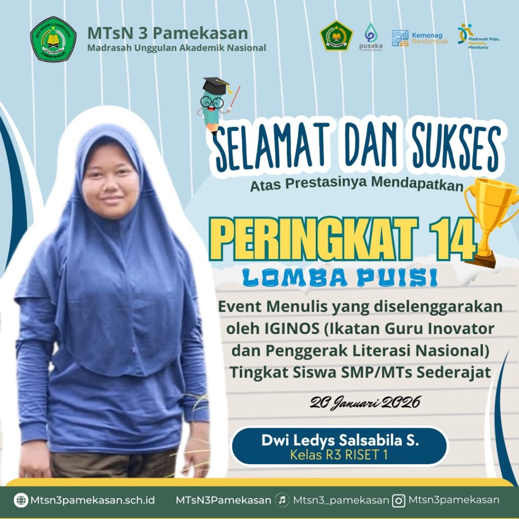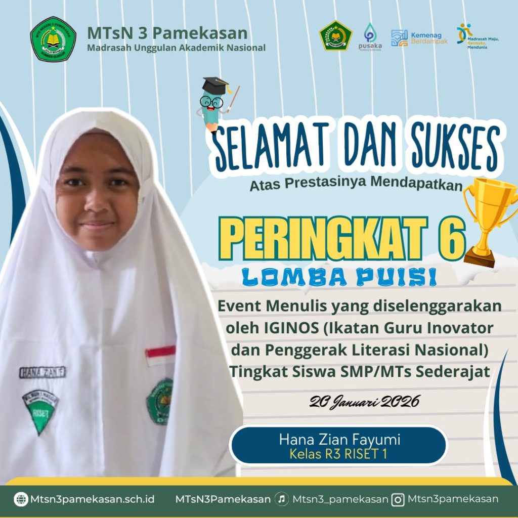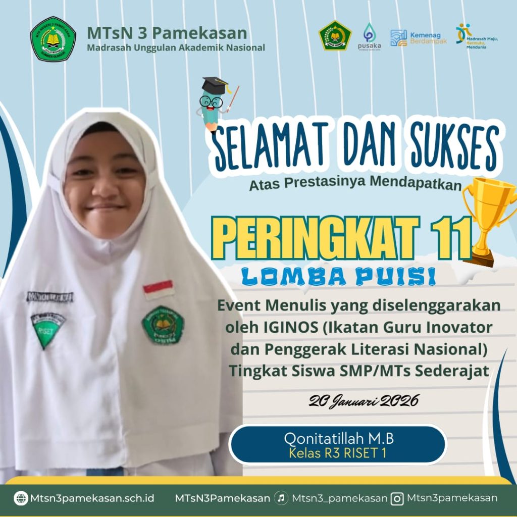 Ajang lomba IGINOS ini bukan sekadar kompetisi, melainkan sebuah gerakan literasi nasional yang mengajak seluruh insan pendidikan untuk menulis dengan hati dan mengabdi dengan ketulusan. Karya-karya yang lahir dari lomba ini menjadi saksi bahwa menulis bukan hanya aktivitas akademik, tetapi juga sarana ibadah, refleksi diri, serta bentuk pengabdian kepada bangsa dan negara. Dengan capaian prestasi yang diraih, MTsN 3 Pamekasan kembali menegaskan eksistensinya sebagai madrasah yang tidak hanya unggul dalam bidang akademik, tetapi juga aktif dalam pengembangan literasi. Semoga prestasi ini menjadi pemantik semangat bagi seluruh warga madrasah untuk terus menulis, berkarya, dan mengukir prestasi, serta menjadikan literasi sebagai napas dalam setiap langkah pendidikan.