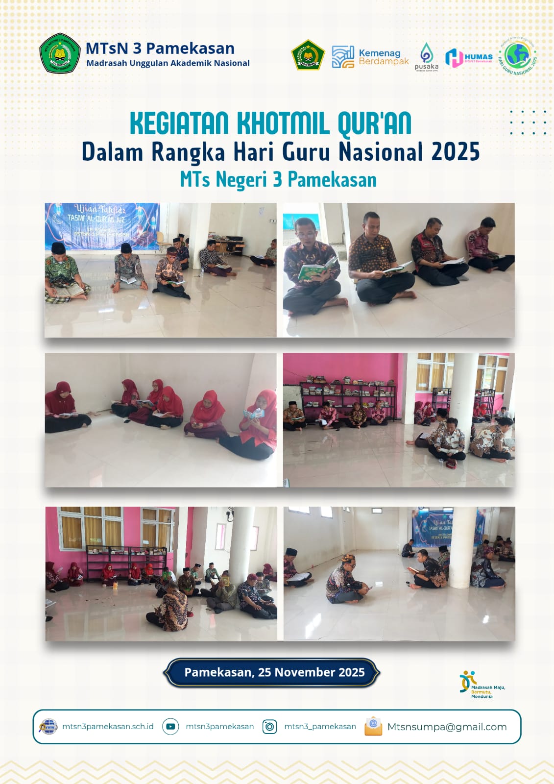 Rangkaian kegiatan berlanjut dengan Khatmil Qur’an yang diperuntukkan bagi seluruh guru dan tenaga kependidikan. Kegiatan ini bertempat di masjid madrasah dan dipimpin oleh Bapak Ruspandi, S.H., S.Pd.I.. Khatmil Qur’an menjadi simbol doa, harapan, serta bentuk penghormatan spiritual bagi seluruh tenaga pendidik atas ilmu yang mereka ajarkan sebagai bagian dari amal jariyah.